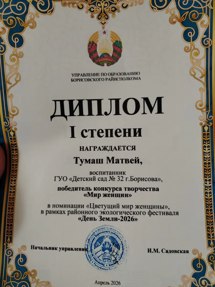 Тумаш Матвей, воспитанник группы № 6 "Малышок", награжден дипломом I степени;