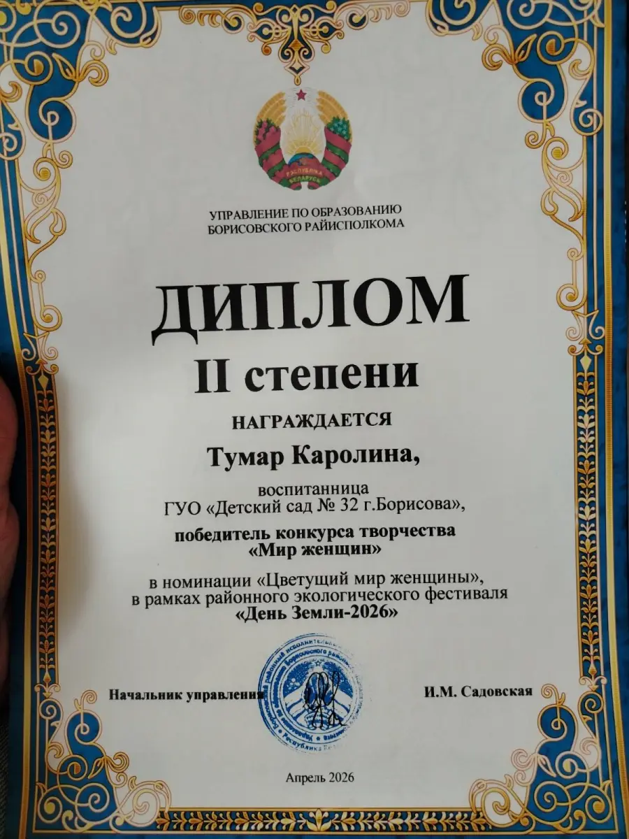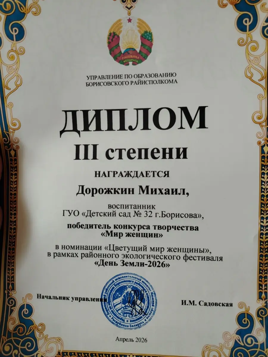 Воспитанники нашего учреждения дошкольного образования приняли активное участие в творческом конкурсе "Мир женщин" и были награждены дипломами: