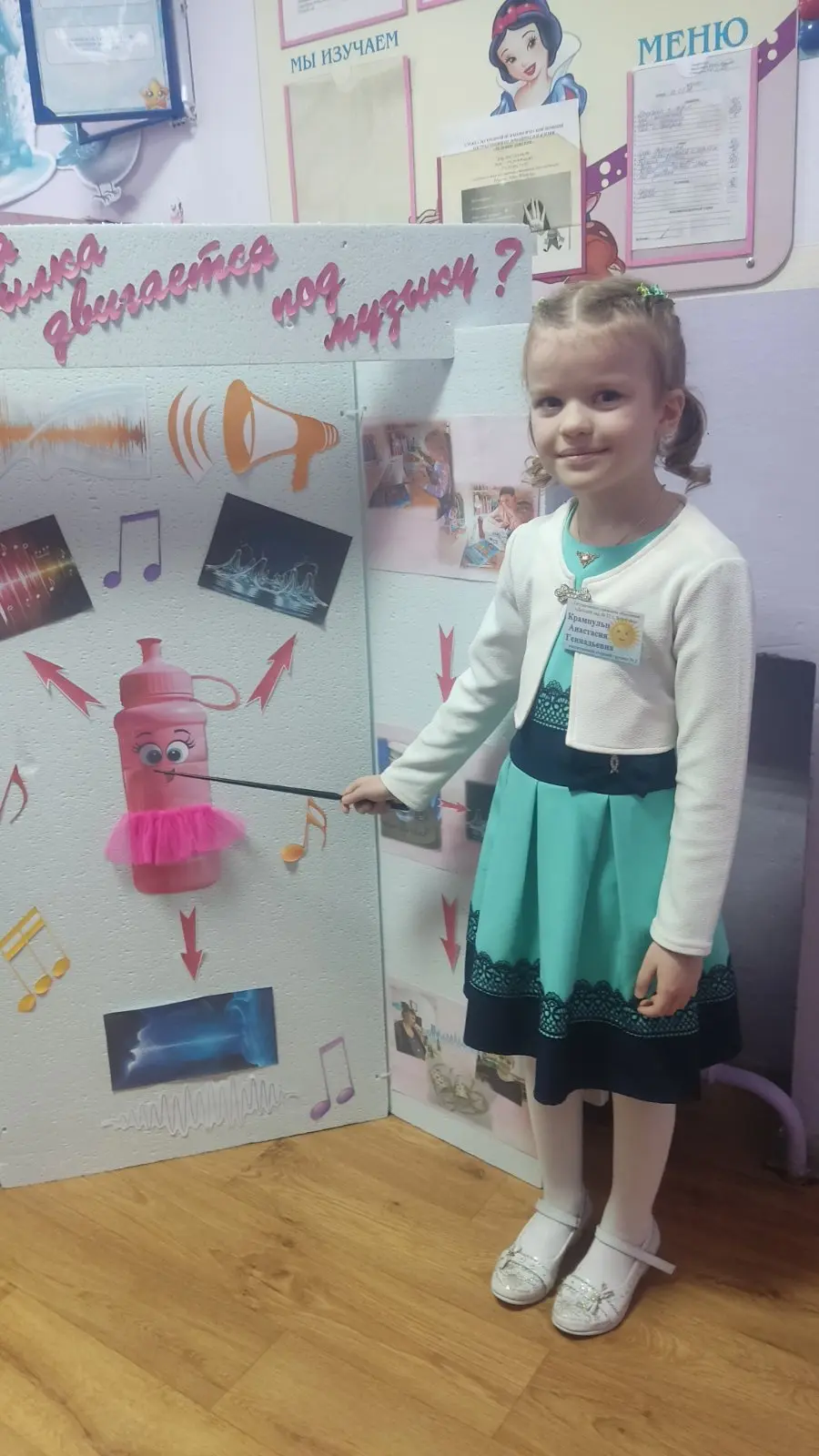 Крампульц Анастасия, воспитанница группы № 2 "Дюймовочка" с исследовательской работой "Почему спортивна бутылка двигается под музыку?";