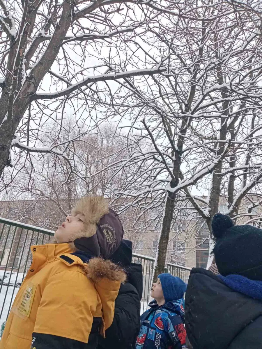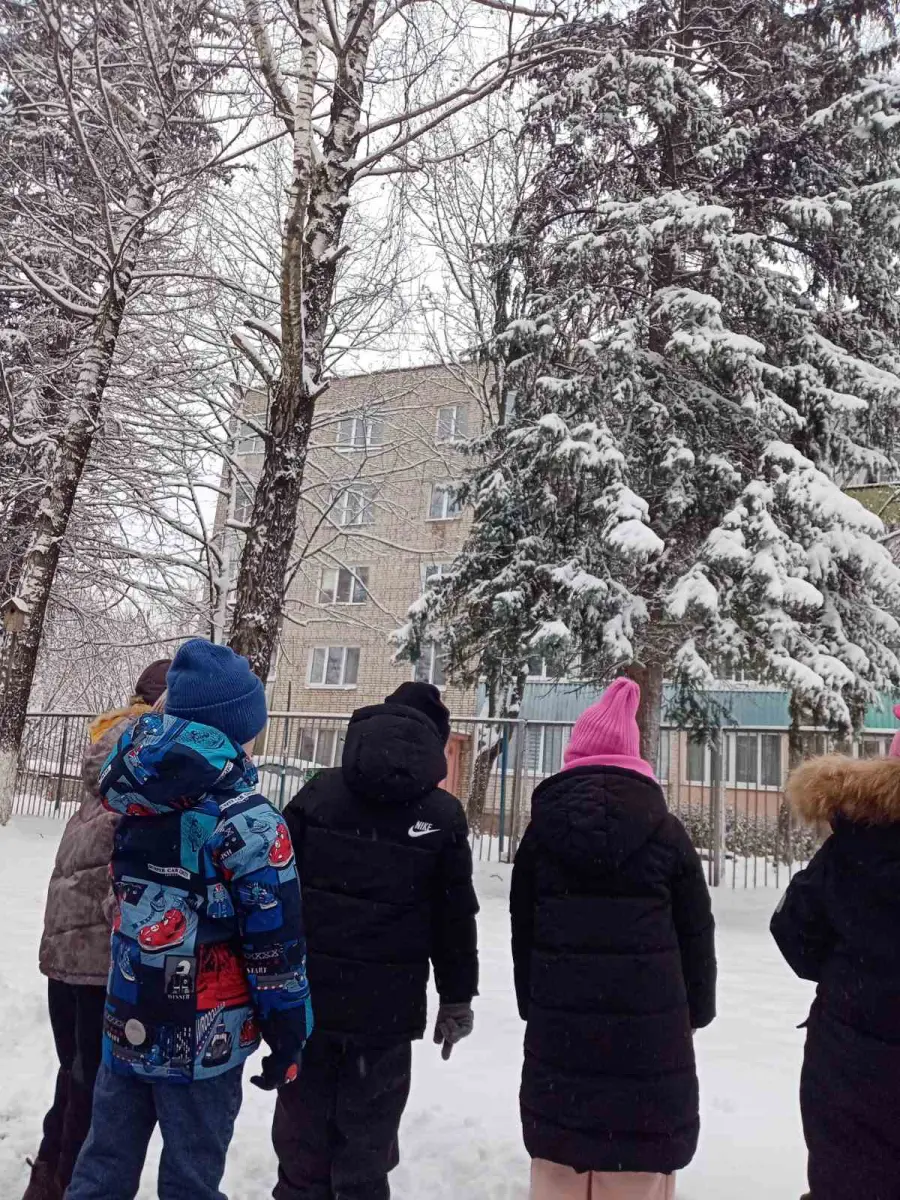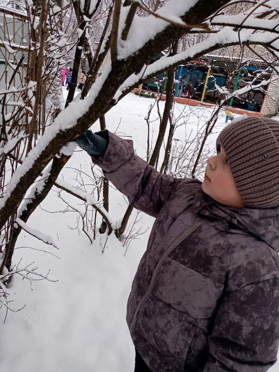 Воспитанники старшей группы № 4 "Буратино" во время прогулки наблюдали, как с неба медленно падают снежинки и ложатся на землю, образуя сугроб, покрывая крыши домов. Рассматривая снег на варежке, выяснили, что он состоит из маленьких снежинок. А еще узнали, какую пользу приносит снег растениям.