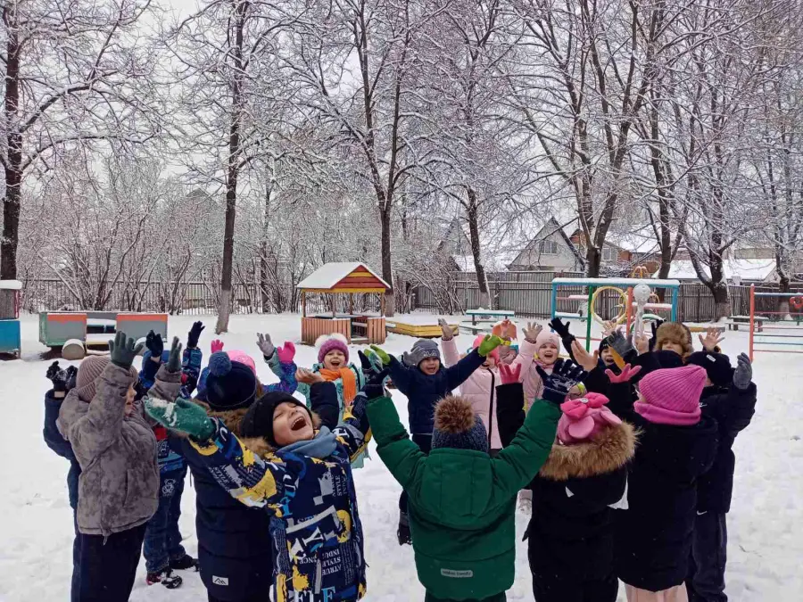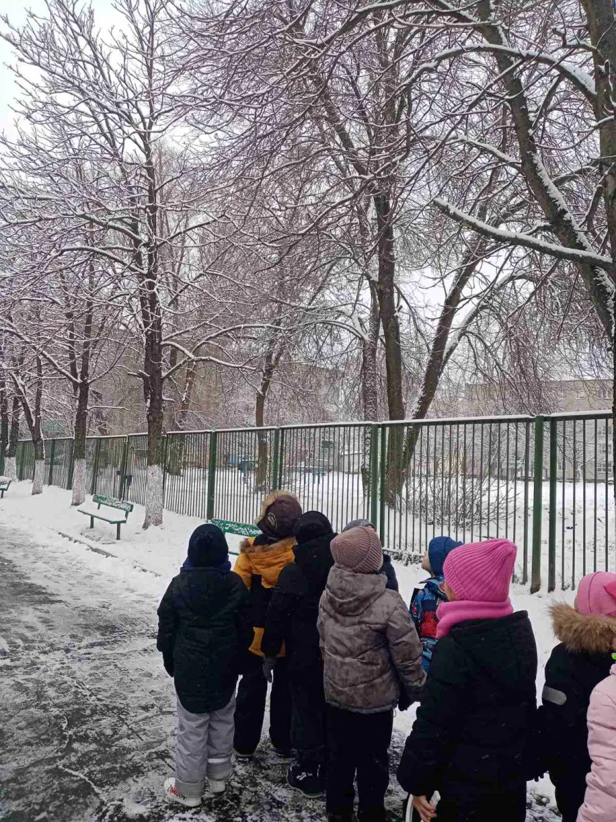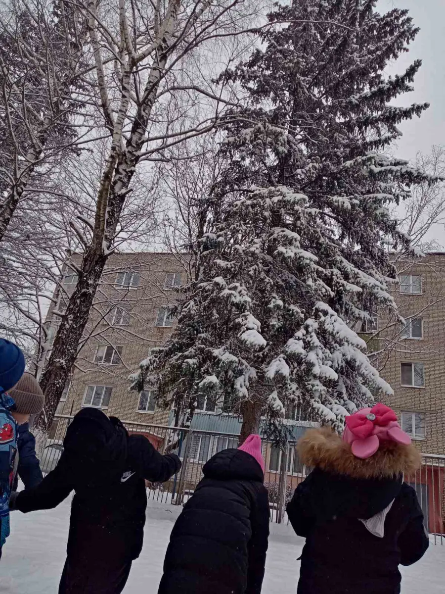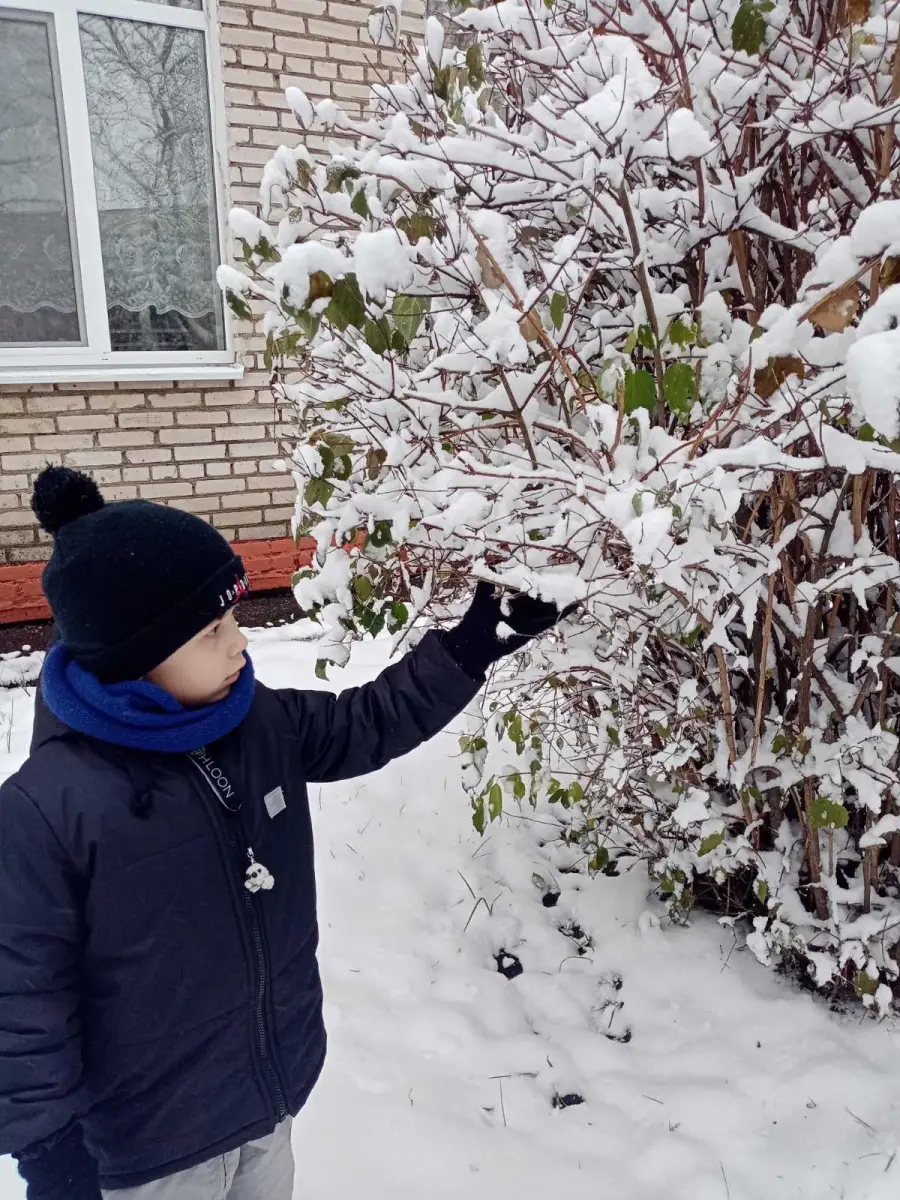 Воспитанники старшей группы № 4 "Буратино" во время прогулки наблюдали, как с неба медленно падают снежинки и ложатся на землю, образуя сугроб, покрывая крыши домов. Рассматривая снег на варежке, выяснили, что он состоит из маленьких снежинок. А еще узнали, какую пользу приносит снег растениям.